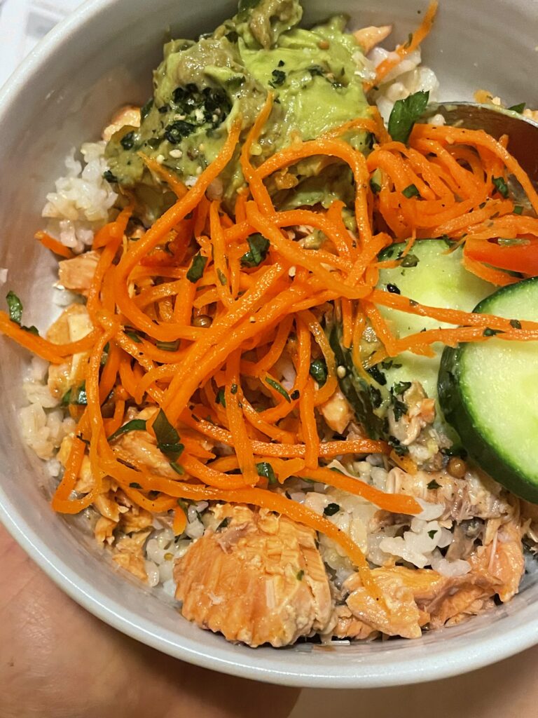 Salmon bowl! For this meal, I used brown rice as my base. The protein source is canned salmon, but it contains bones and this provides me with protein, omega-3 fatty acids (EPA and DHA), vitamin D, B vitamins (especially B12), selenium, and potassium. These nutrients support heart and brain health, reduce inflammation, boost immunity, and contribute to overall well-being. I then added sliced cucumbers, and guacamole that I purchased, The guacamole provides healthy fats and the cucumbers are rich in water, which promotes hydration, and provide vitamin K for bone health, along with antioxidants like beta-carotene and lignans that protect cells and reduce disease risk. I topped it with marinated carrots, which are quite nutrient-dense, offering high levels of beta-carotene (turns to vitamin A), fiber, and vitamin K, along with moderate amounts of other vitamins and minerals such as vitamin C and potassium. They are low in calories, fat, and protein, primarily composed of water and carbohydrates. The seasoning is furikake — it provides small amounts of protein, fiber, calcium, and iron from its common components like sesame seeds, seaweed, and dried fish. This was a very low effort meal, and it was very affordable. Making the guacamole yourself can be more cost-efficient because it can be stored and used for multiple meals. It may also be healthier because you can add higher quality ingredients.